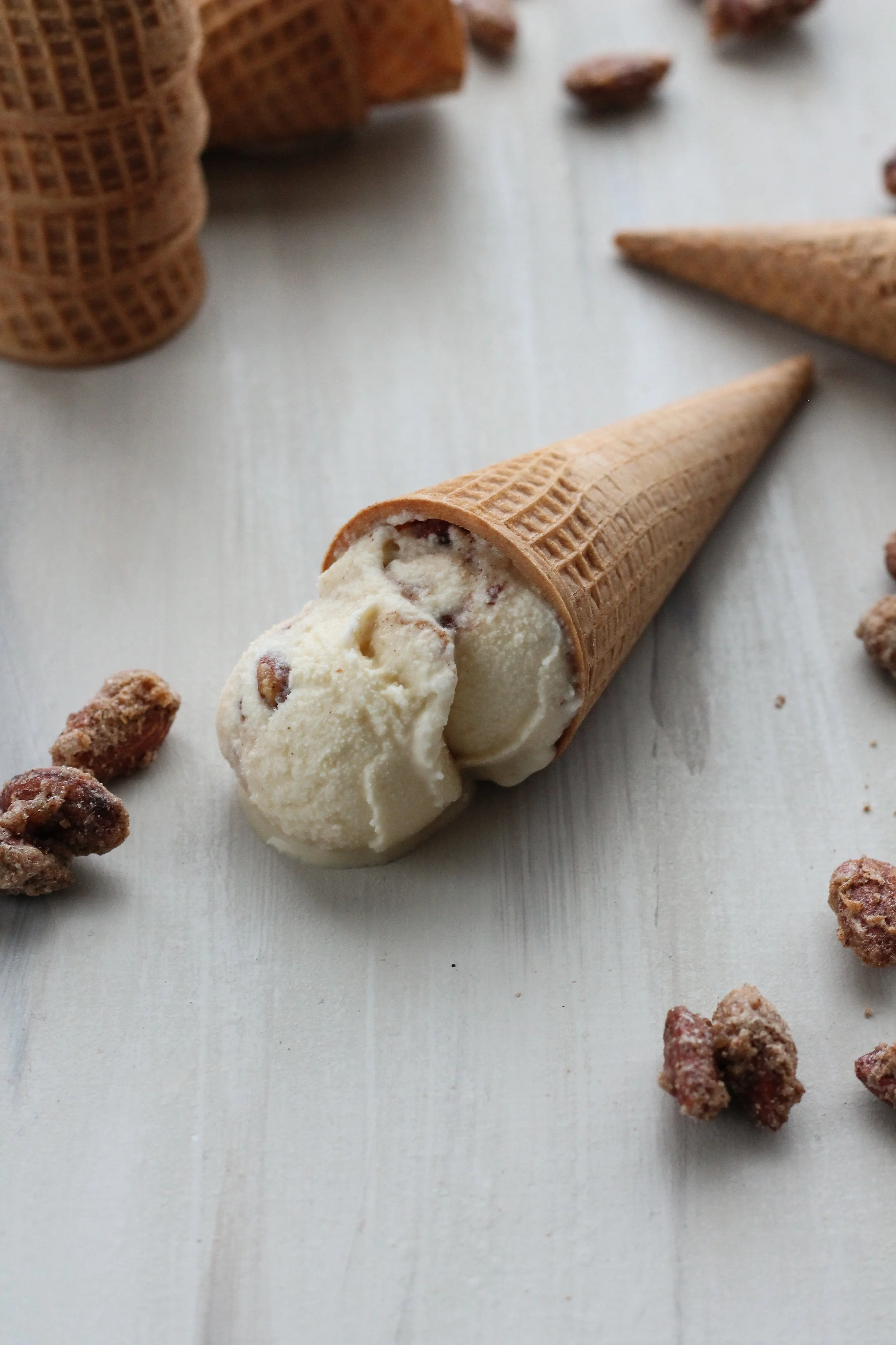 Prepare in an ice cream maker according to your manufacturer's directions. After the ice cream has churned, fold in candied almonds. Transfer to an airtight container and freeze until solid.