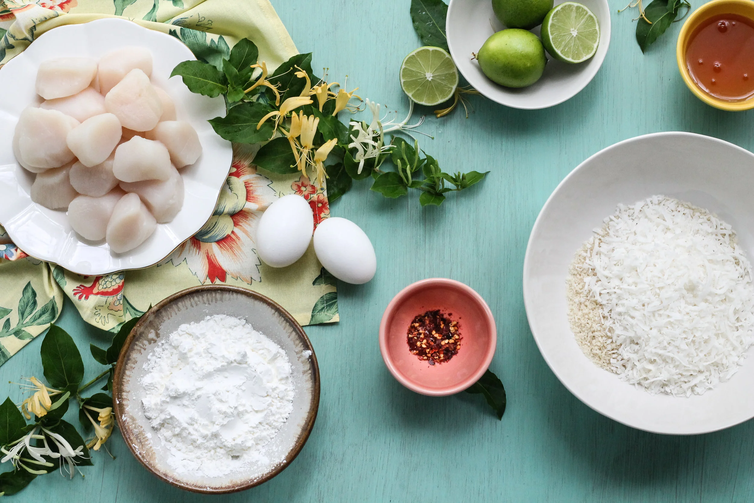 Working one at a time, toss scallops in the cornstarch mixture and shake to remove any excess. Coat well in the beaten eggs, then toss in the panko and coconut mixture, patting the breading ever so gently so that it adheres to the scallops.