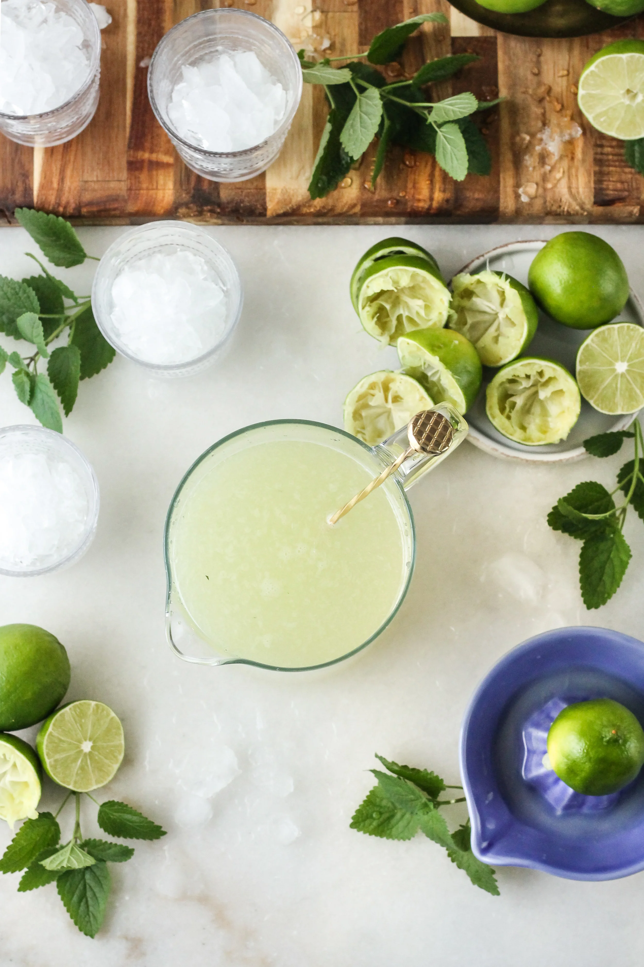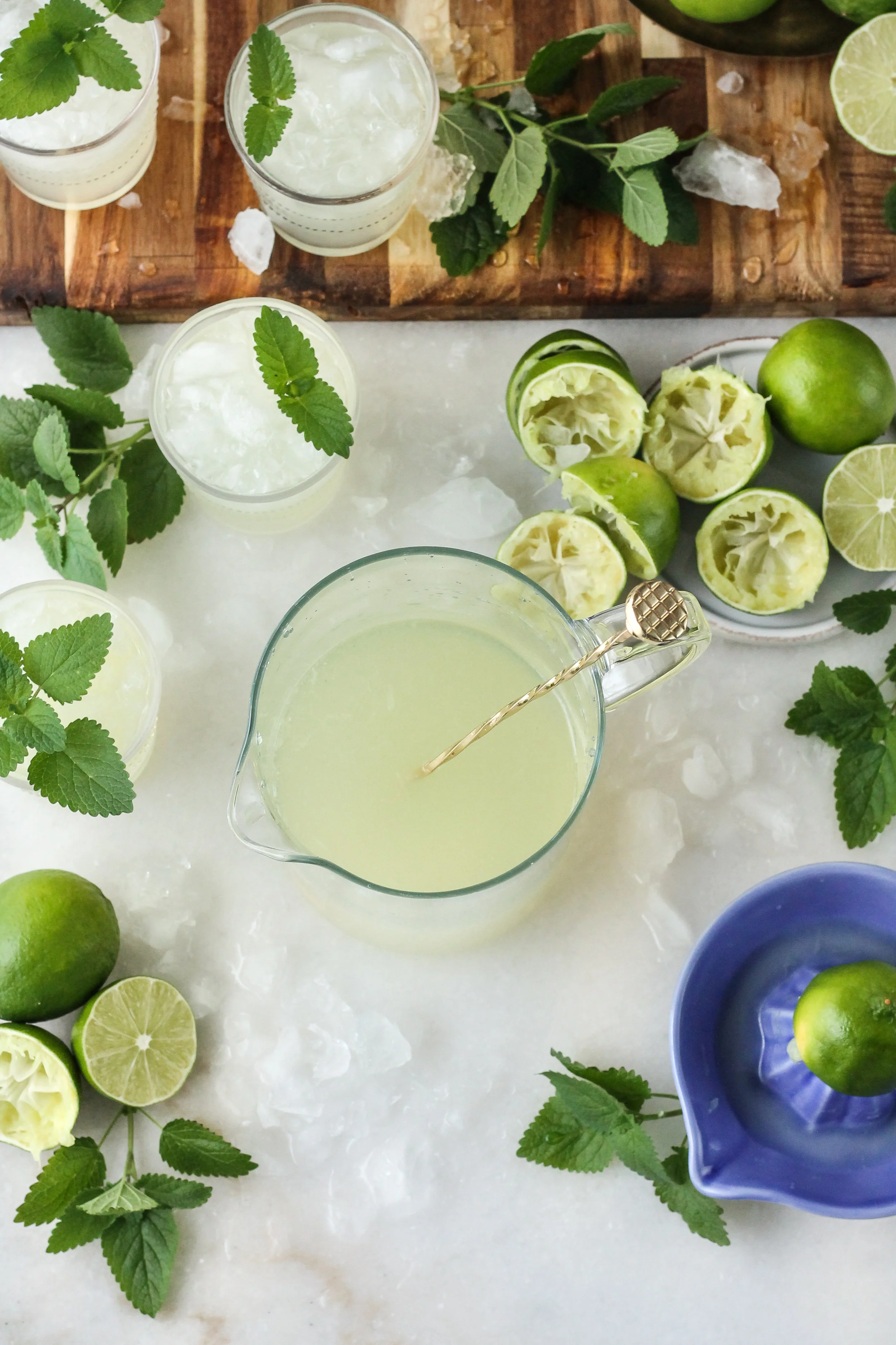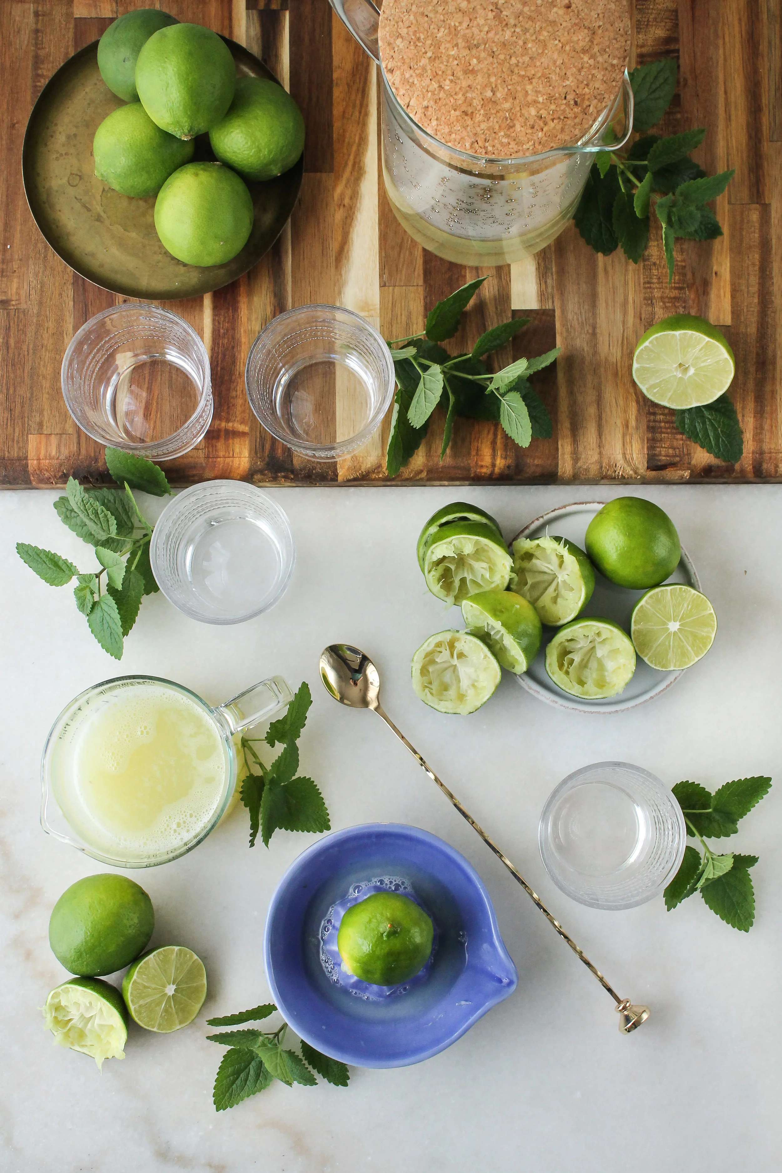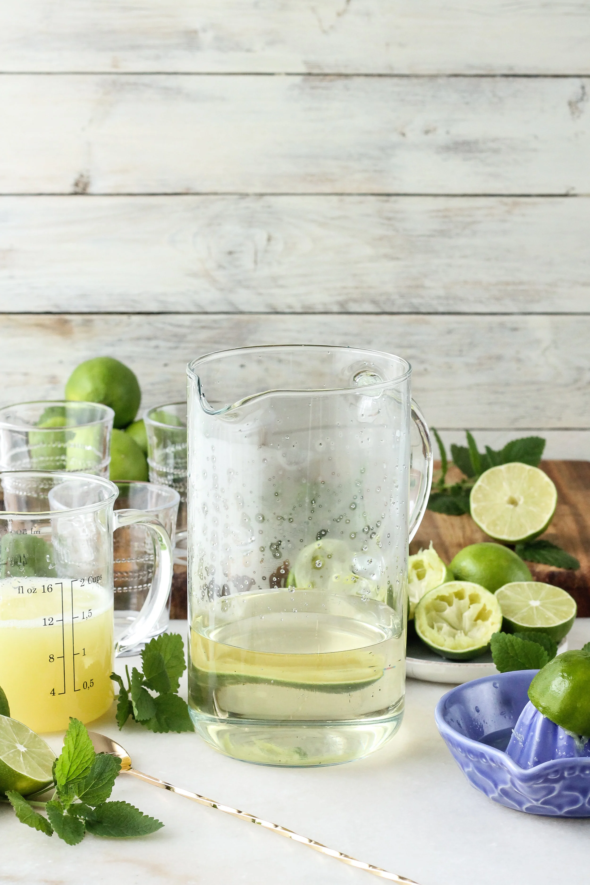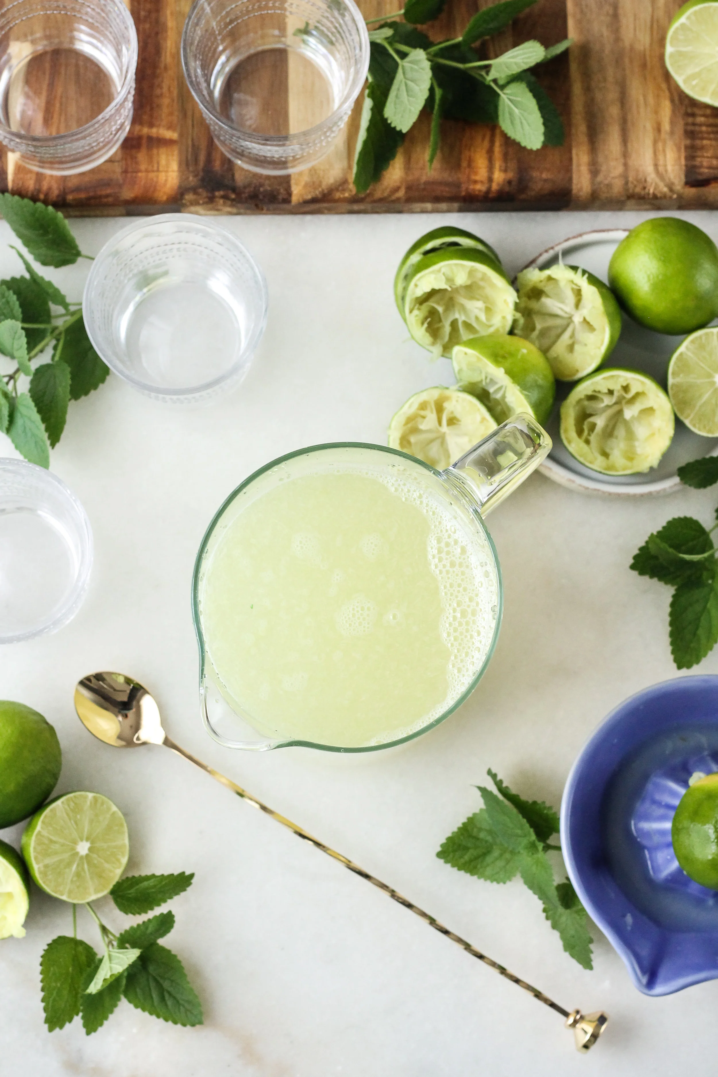 After the syrup has cooled and the limes have lended you every last drop of their juice, we can stir together this ultra refreshing limeade.